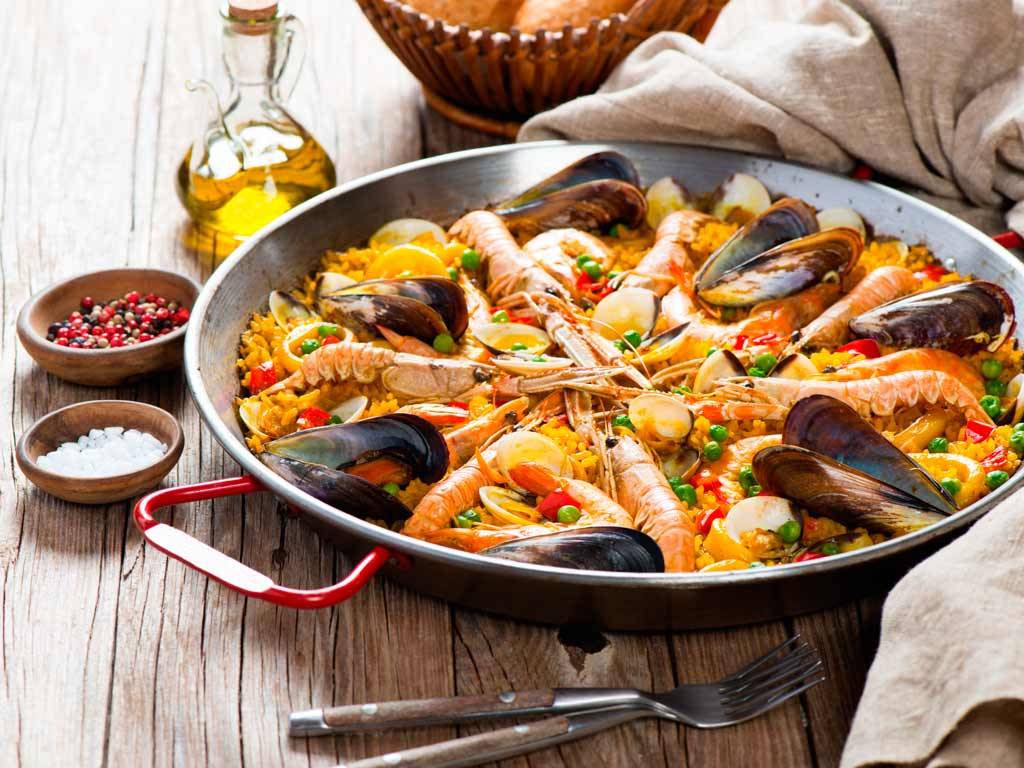 7) Cuando falten 5 minutos para que termine de cocer el arroz agrega los mejillones las almejas y los langostinos reservados anteriormente y unas tiras de pimiento asado a modo de decoración.