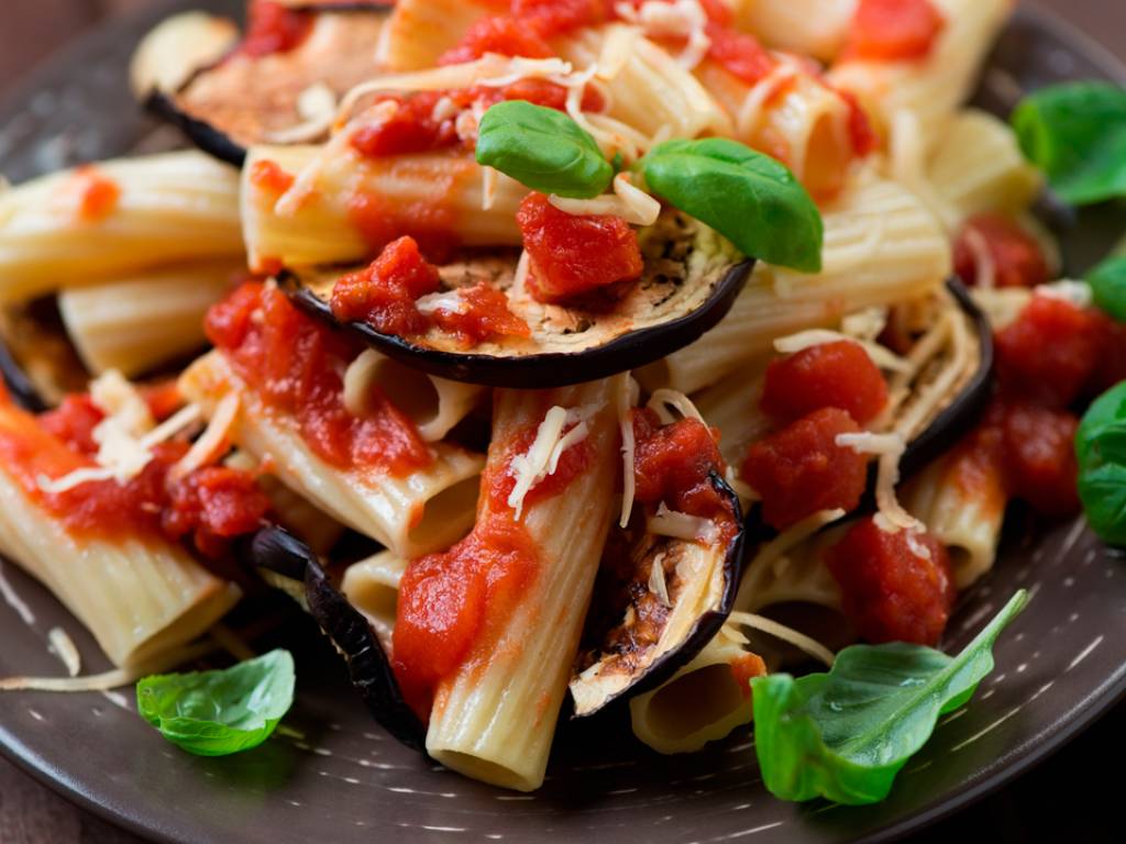 7) Pasado el tiempo de cocción de la pasta (que quede al dente), escúrrela y agrégala junto con la salsa de tomate en la cazuela, mezcla todo y emplata poniendo en cada plato unas rodajas de berenjena frita, a este punto ralla la ricotta salada con un rallador de ralladura gruesa. Una vez servidos los platos, no olvides poner en la mesa una bandeja con el resto de las rodajas de berenjena frita, para que los comensales que lo deseen puedan servirse a gusto.