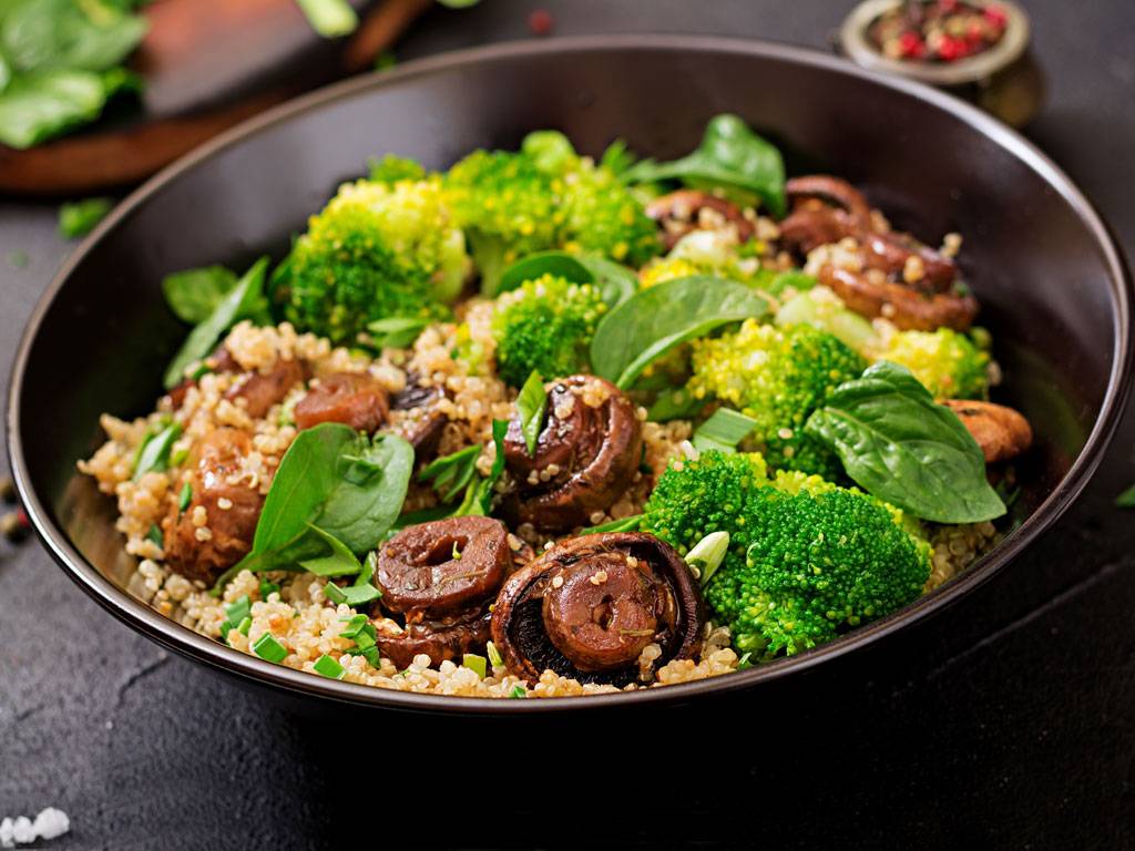 5) En un bol grande, pon la quinoa, los brócolis, agrega el contenido de la sartén, las espinacas y los cubitos de queso de cabra, luego mezcla con cuidado.