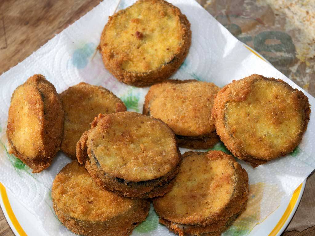 4) Ya puedes comenzar a pasar las berenjenas por la masa y a freírlas en una sartén con abundante aceite de oliva (fríe pocas a la vez), cuando estén doradas, ponlas sobre papel de cocina a escurrir para que absorba el exceso de aceite.