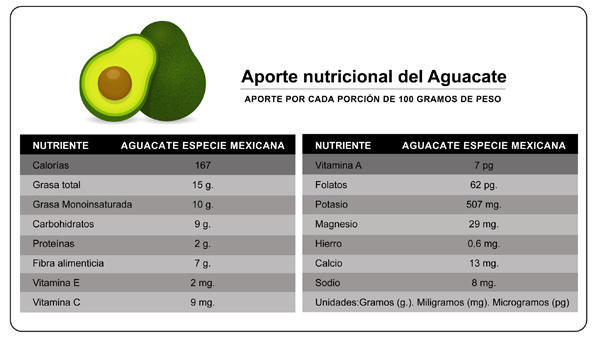 En primavera comienza la temporada de aguacate y se prolonga hasta comenzar el otoño. Suele ser confundido con una verdura, sin embargo, es un fruto proveniente del árbol Persea American que requiere crecer en pareja, es decir: dos árboles juntos, macho y hembra a la vez. Por ello, los aztecas consideraban este fruto símbolo del amor y la fertilidad. Tiene diversas propiedades que son beneficiosas para la salud, convirtiéndolo en un alimento extraordinario con cada vez más consumidores día a día, estos son algunos de sus aportes nutricionales: