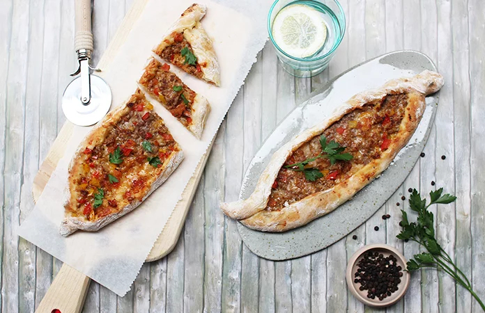 3. Diviser la pâte en morceaux , étaler chaque morceau de pâte en longueur sur un plan de travail fariné , la pâte doit être fine, étaler la garniture sur la pâte et plier les bords en scellant les extrémités comme pour lui donner une forme de bateau.