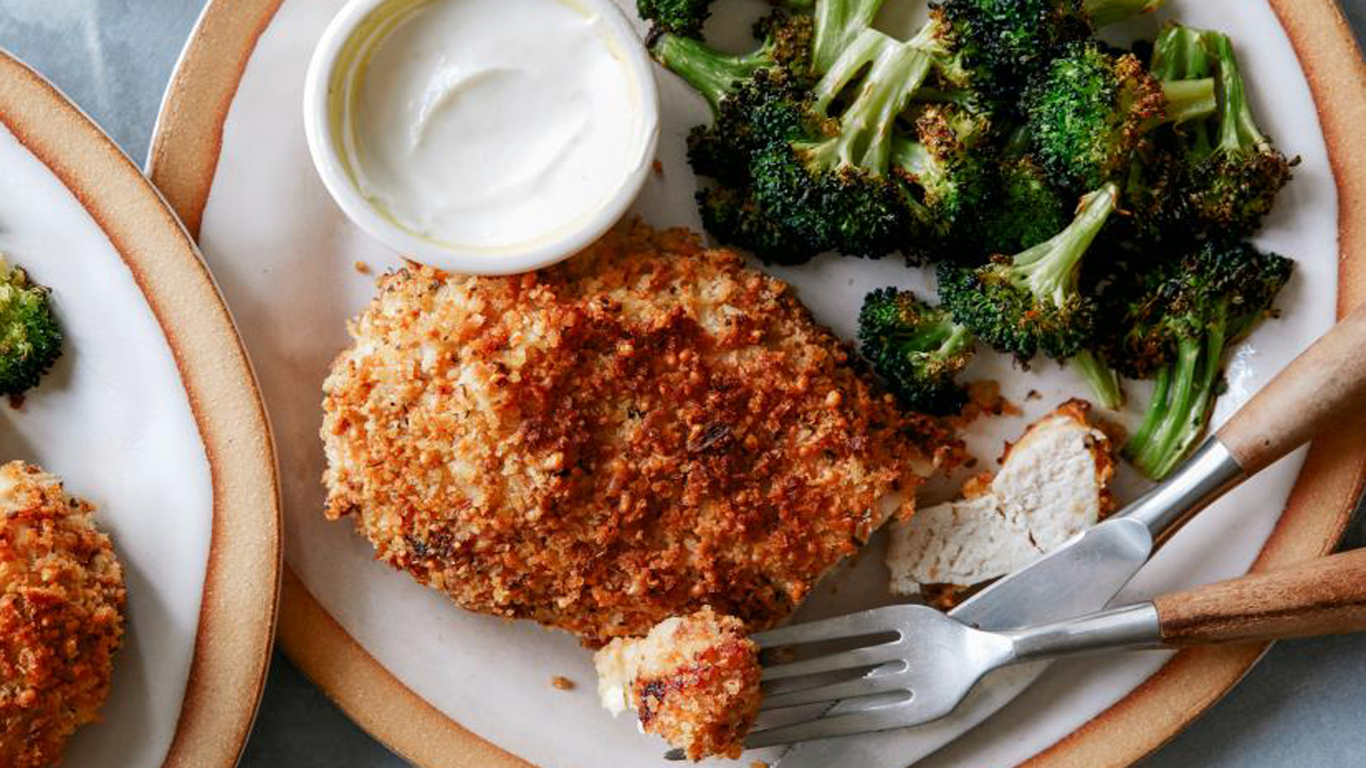 3. Badigeonner les deux côtés du poulet avec 1/2 cuillère à soupe de moutarde de Dijon, puis presser dans le mélange panko-parmesan, en veillant à ce que les deux côtés soient uniformément enrobés.