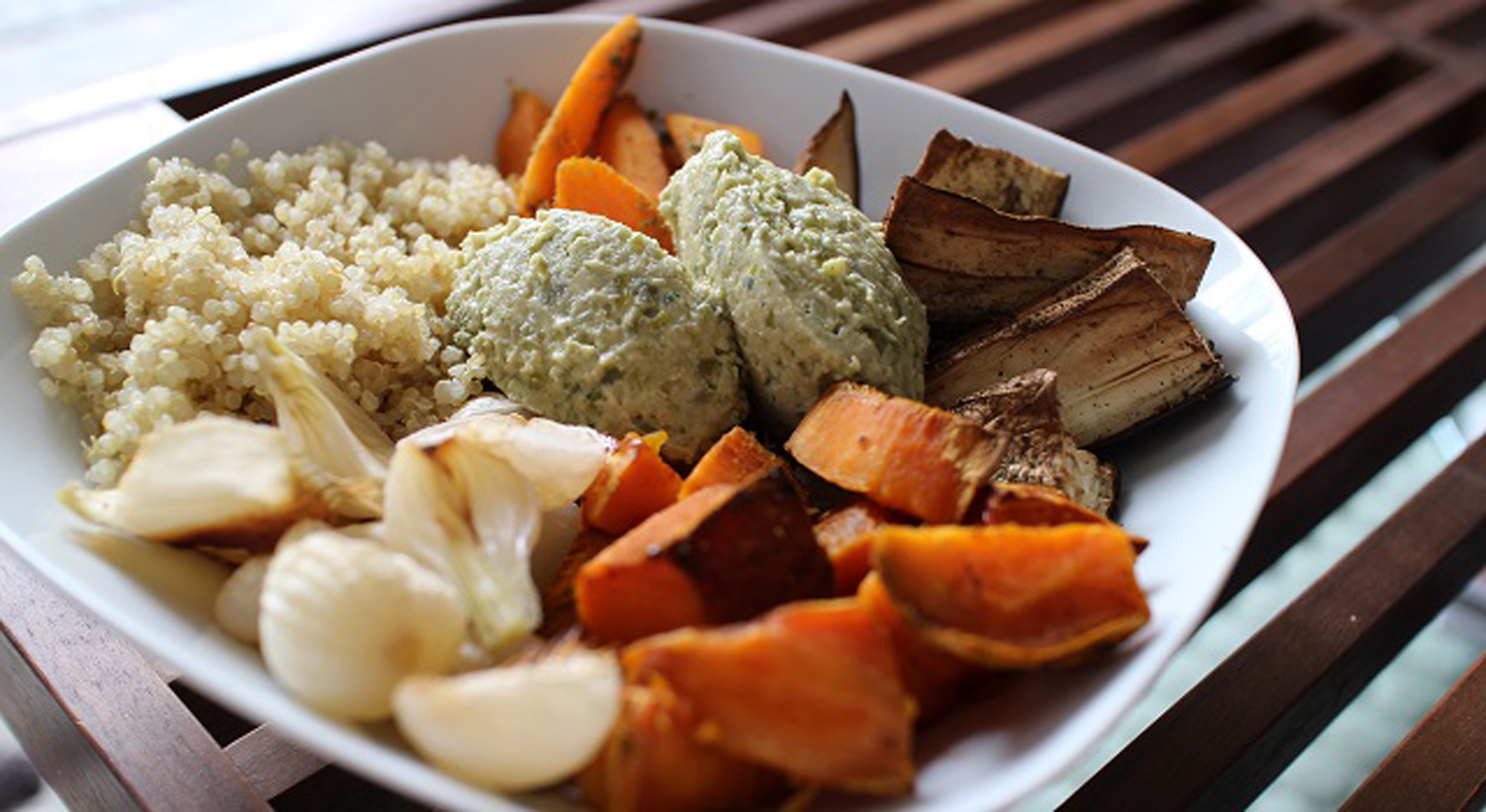 15. Disposez les légumes par couleur dans vos assiettes, ajoutez le quinoa et deux jolies cuillères de purée de pois cassés au centre de l’assiette.