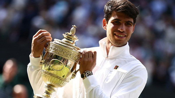 El tenista español Carlos Alcaraz ganó su segundo título de Wimbledon al imponerse en la final al serbio Novak Djokovic por 6-2, 6-2 y 7-6 (7/4). Djokovic, de 37 años, que no pudo elevar a 25 su récord de trofeos de Grand Slam ganados en su carrera, parece hacer un simbólico pase de testigo con esta derrota ante Alcaraz, de 21 años, que ya le había vencido en la final de Wimbledon el año pasado.