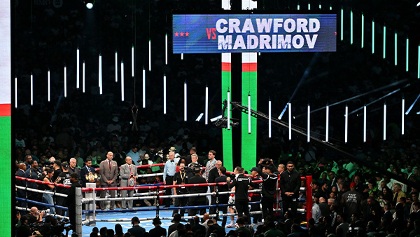 Los primeros asaltos del combate fueron de reconocimiento, con intercambios de golpes esporádicos. Durante el quinto asalto, Madrimov mostró una buena defensa y evitó los golpes de Crawford con un hábil juego de cadera. A poco más de un minuto del final del asalto, Crawford se atoró con el pie del uzbeko y cayó de espaldas. A lo largo del combate, Crawford dominó con una sólida defensa y un uppercut preciso, mientras que Madrimov respondió con potentes derechazos.
