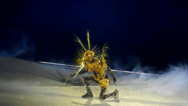 Nas redes sociais, o personagem central do espetáculo chamado “Records”, um viajante dourado tirado da ficção científica, foi qualificado como “uma coisa com um traje dourado” por um internauta, outro o viu como “uma barata”, “uma vespa interestelar” ou um “mosquito às quatro da manhã”.