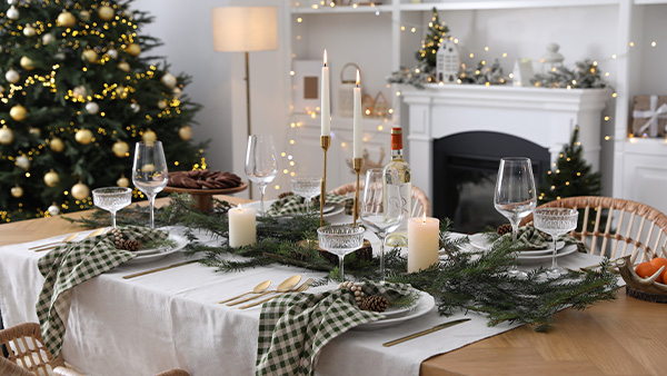 Rojo, verde y dorado: Esta paleta clásica nunca pasa de moda y evoca el espíritu navideño tradicional. Úsala con manteles blancos para equilibrar la intensidad.