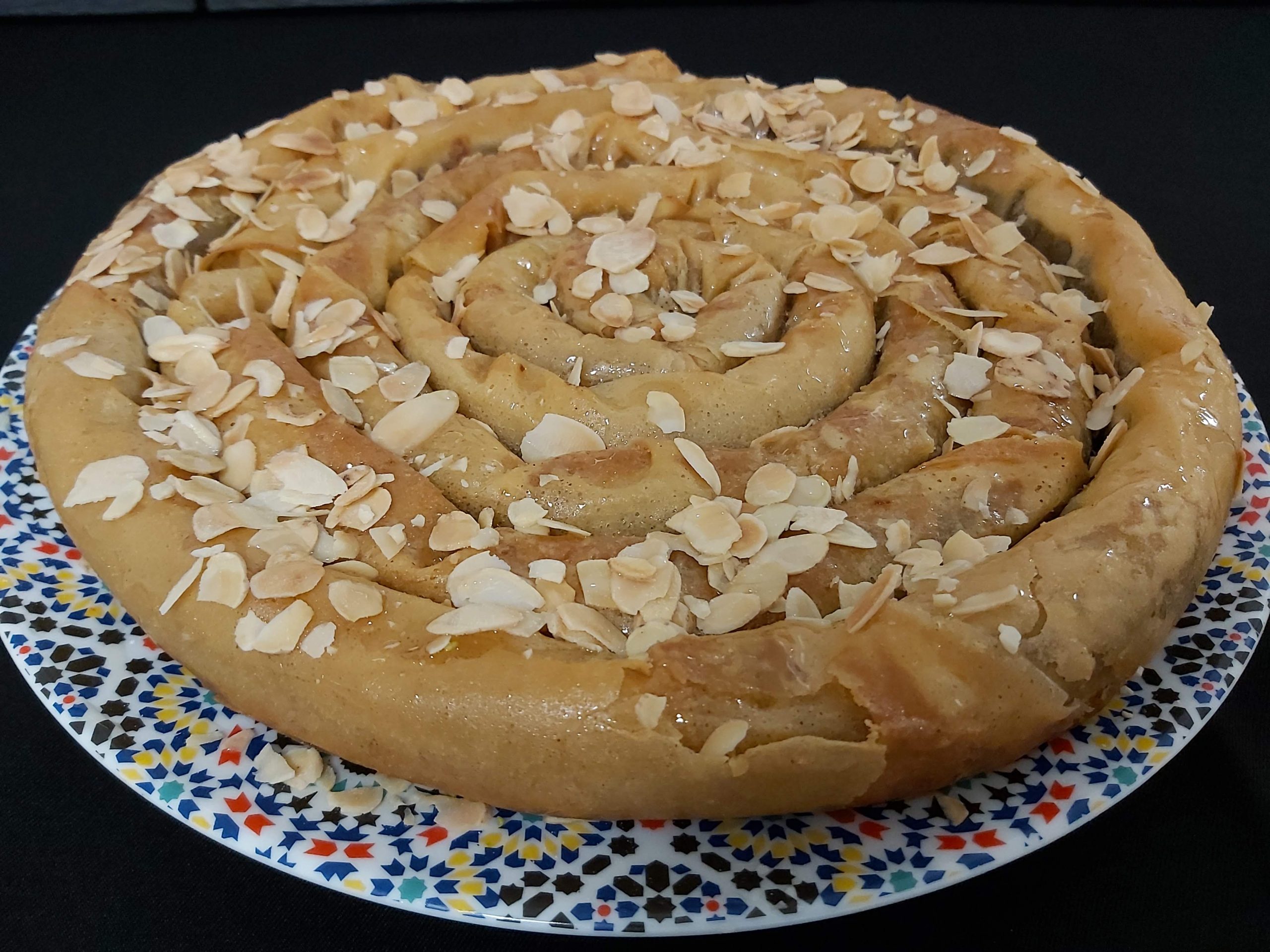 À la sortie du four, arrosez la mhancha avec le miel et parsemez d'amandes concassées.