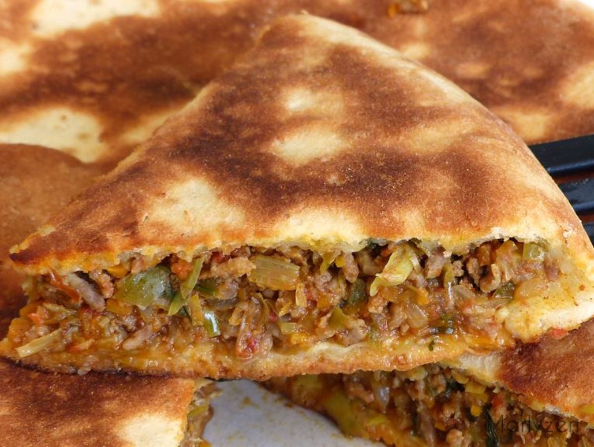 7. Enduire une poêle d’huile puis mettre un premier fond de pâte (le plus large), et foncez la poêle avec cette pâte comme pour un mole à tarte. Garnir du mélange viande/légumes.