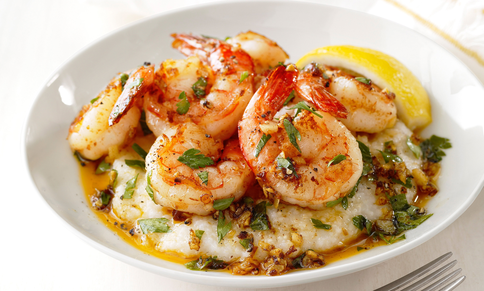 7. Répartir le gruau dans des bols peu profonds et garnir de crevettes et de sauce. Servir avec des quartiers de citron.