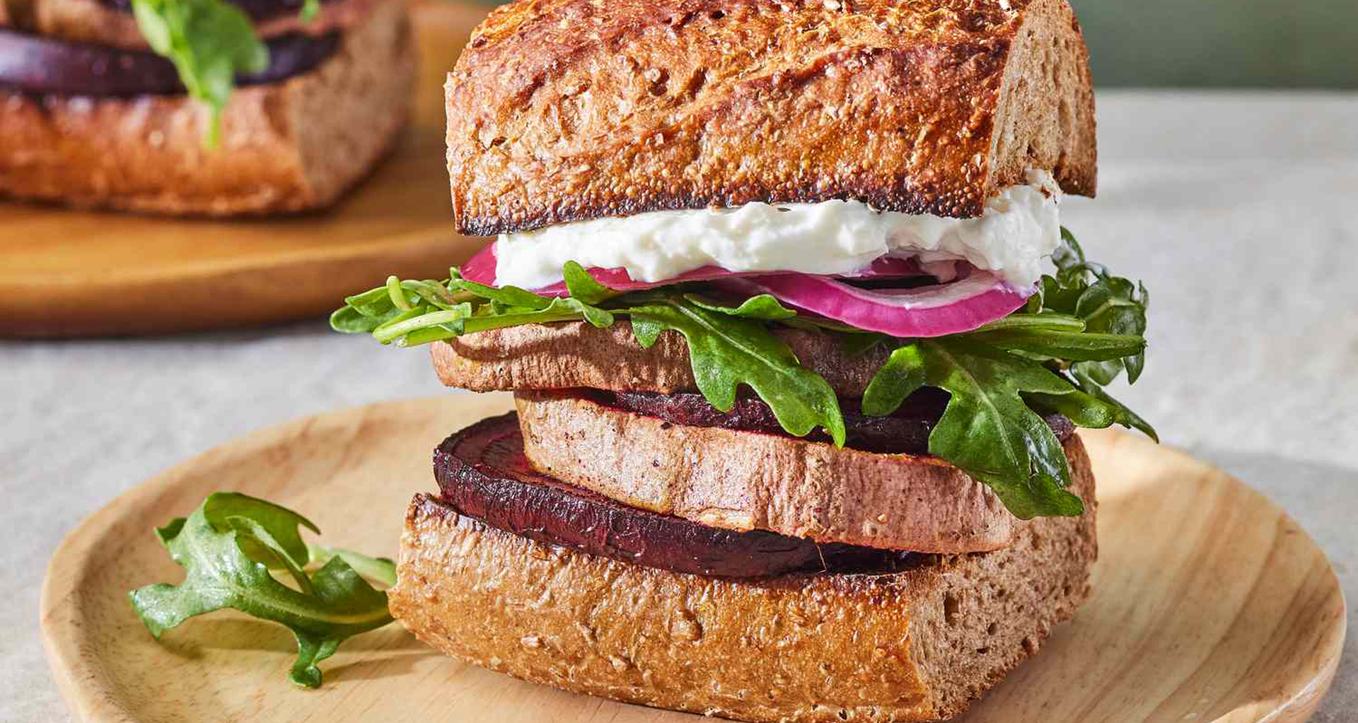6. Disposer les patates douces et les betteraves sur le fond de la baguette. Garnir de verdure et d'oignon.