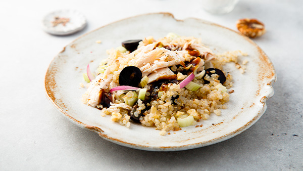 Cambia el pollo por garbanzos si buscas una opción veggie. El contraste con las uvas sigue siendo espectacular.