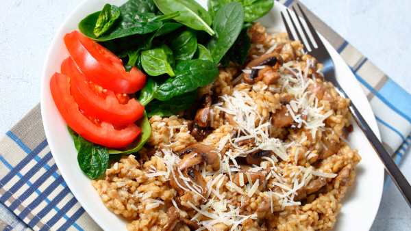 Es el clásico plato reconfortante que te salva cualquier día de oficina. Las setas, que comienzan a aparecer en septiembre, se unen a las espinacas frescas y al arroz integral para un resultado sabroso, nutritivo y muy fácil de preparar.