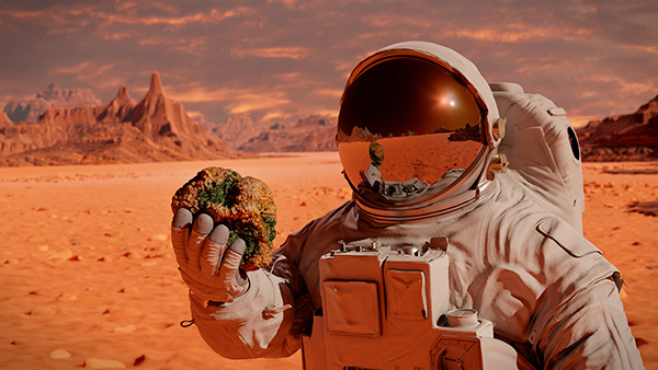 Llevar alimentos desde la Tierra no sería sostenible a largo plazo. Por eso, la investigación actual se centra en la posibilidad de cultivar en Marte. Experimentos con simulantes de suelo marciano han demostrado que, con nutrientes añadidos y bajo invernaderos presurizados, es posible cultivar vegetales básicos como patatas o lechugas. Sin embargo, el suelo marciano contiene percloratos tóxicos que deberán eliminarse antes de usarlo para la agricultura.