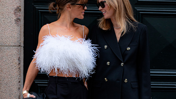 Cuando la cena de empresa tiene entrada directa a discoteca, conviene asumirlo desde el principio. El top de plumas es una declaración de intenciones que funciona mejor cuando se combina con prendas más sobrias, como un pantalón negro recto o una falda ‘midi’ sencilla. El resultado es un look claramente nocturno, festivo y pensado para bailar, pero que sigue manteniendo cierto control estético. Porque sí, es posible divertirse sin perder el estilo.