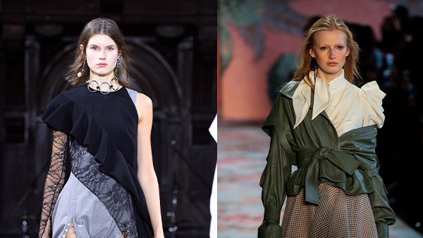 Las asimetrías regresan con fuerza, pero lo hacen desde una sofisticación mucho más depurada que en temporadas pasadas. Hombros desnudos que contrastan con mangas largas, bajos irregulares que dejan ver la pierna de forma inesperada, volantes que recorren el torso en diagonal. La clave no está en el exceso, sino en el gesto.