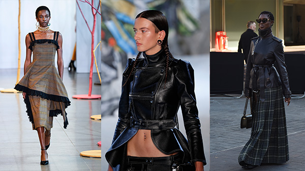 El negro vuelve a dominar la narrativa primaveral, pero no desde el minimalismo frío, sino desde una estética gótica reinterpretada. Cuero estructurado, faldas largas con vuelo, cinturones marcando la cintura, gargantillas y botas contundentes. Todo bajo una luz más urbana y pulida.