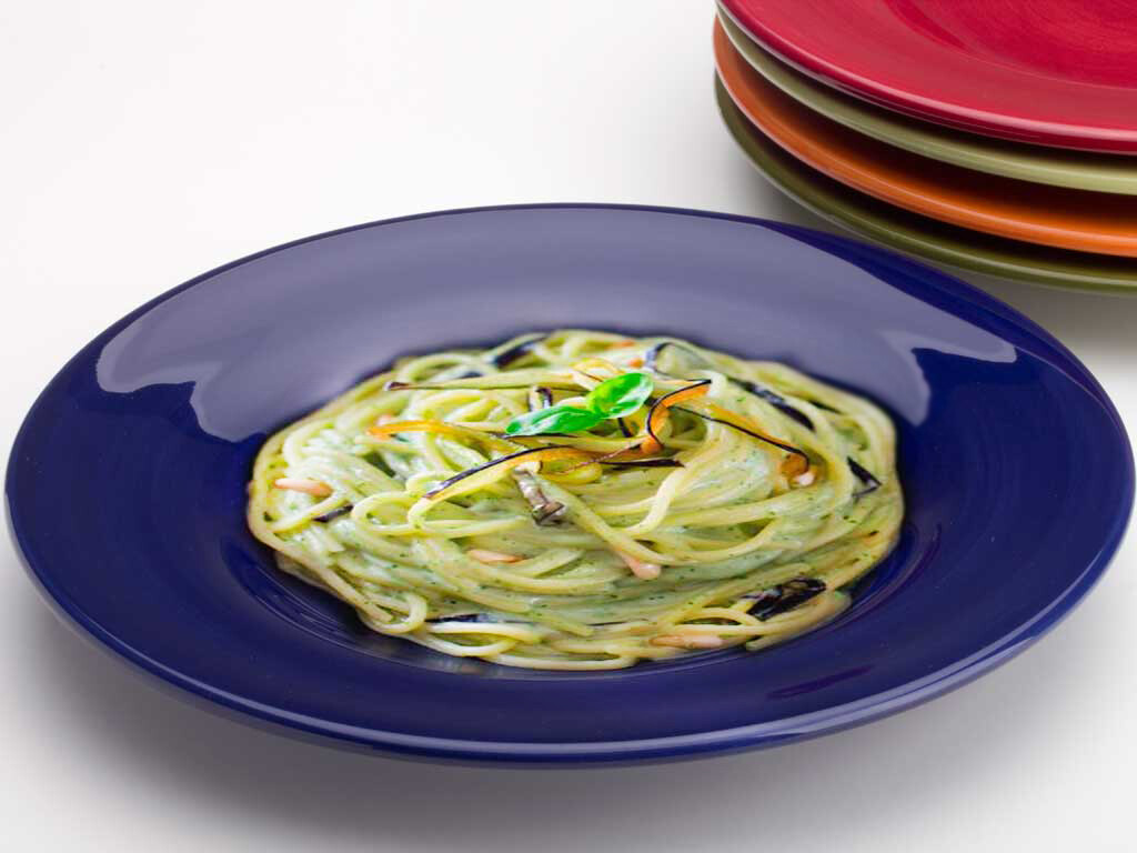 Esta receta de espaguetis te resultará elegante y fresca, cuando el fresco perfume de la albahaca se mezcla a la delicadeza de la mozzarella y la berenjena el éxito está asegurado. Un consejo si encuentras la burrata para sustituirla con la mozzarella este plato ganará en calidad y sabor.
