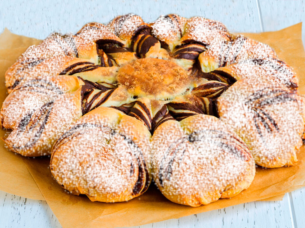 Postre de hojaldre relleno de chocolate negro decorado con almendras, muy simple en su elaboración y que da un espectacular resultado final.